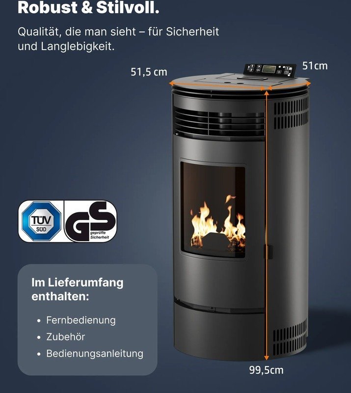 Der UMBRELLA PR8 Pelletkaminofen kombiniert modernes Design mit leistungsstarker Heiztechnik und intelligenter Steuerung. Mit einer Nennleistung von 9 kW und einem Wirkungsgrad von 84,1 % sorgt er für behagliche Wärme in Räumen bis zu 220 m³ – effizient, umweltfreundlich und komfortabel.